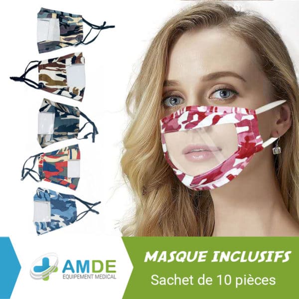Ce masque lavable en tissu doté d’une feuille plastique permet à ceux qui le porte un compromis idéal entre une protection efficace et la possibilité de faire transparaître ses émotions faciales.